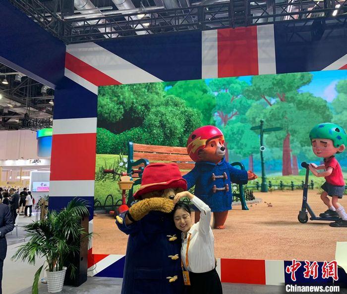 觀眾在英國(guó)展區(qū)內(nèi)與帕丁頓熊合影。中新財(cái)經(jīng) 宮宏宇 攝