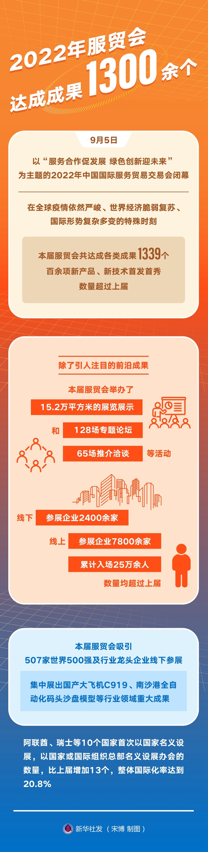 新華社北京9月5日電(記者吉寧)9月5日,以“服務(wù)合作促發(fā)展 綠色創(chuàng)新迎未來”為主題的2022年中國國際服務(wù)貿(mào)易交易會閉幕。在全球疫情依然嚴(yán)峻、世界經(jīng)濟(jì)脆弱復(fù)蘇、國際形勢復(fù)雜多變的特殊時刻,本屆服貿(mào)會共達(dá)成各類成果1339個,百余項(xiàng)新產(chǎn)品、新技術(shù)首發(fā)首秀,數(shù)量超過上屆。