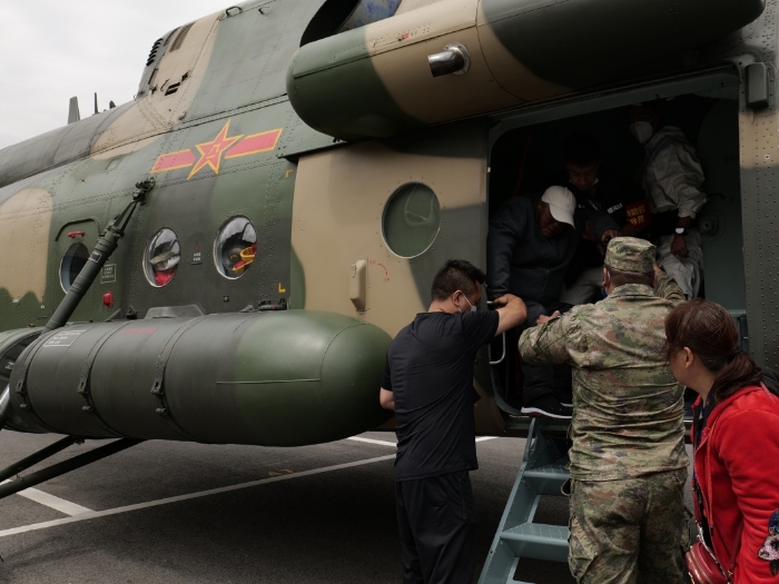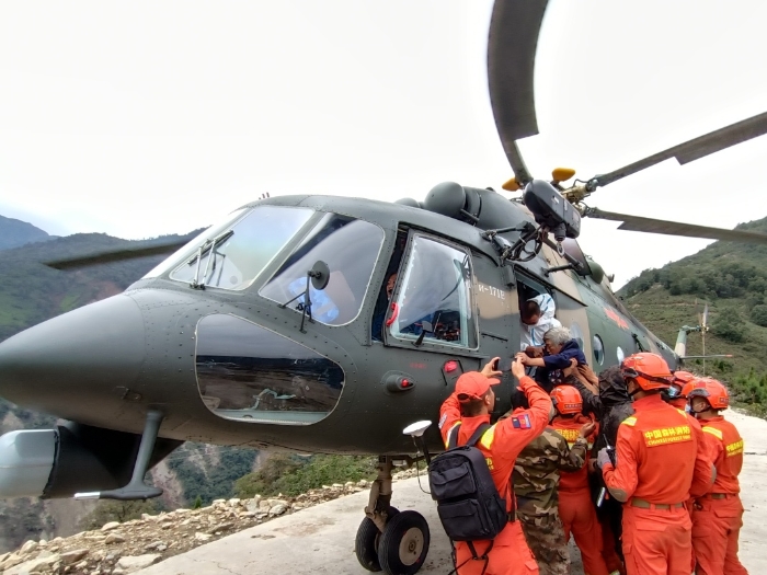 9月6日10時(shí),武警四川總隊(duì)甘孜支隊(duì)官兵在水流湍急的燕子溝河谷架設(shè)繩索,打通與對(duì)岸村莊的聯(lián)系,并協(xié)同進(jìn)行轉(zhuǎn)運(yùn)傷員、搬運(yùn)物資等。在沒(méi)有合適機(jī)降點(diǎn)的情況下,西部戰(zhàn)區(qū)陸軍第77集團(tuán)軍某陸航旅兩架直升機(jī)采取空中懸停、吊籃救生、單輪懸停等方式,從紅花崗村、共和村、灣東村轉(zhuǎn)運(yùn)出27名重傷員。