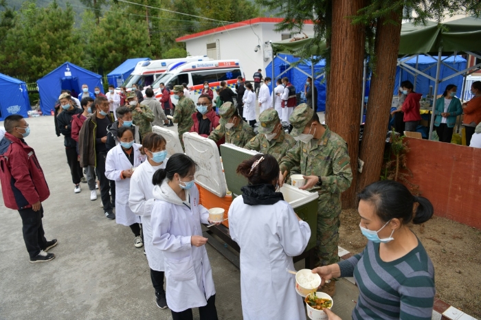 9月6日,西藏軍區(qū)川藏兵站部某大站救援隊(duì)抵達(dá)瀘定縣磨西鎮(zhèn),開(kāi)設(shè)臨時(shí)熱食供應(yīng)站為救援人員和受災(zāi)群眾提供保障。新華社發(fā)(任云 攝)