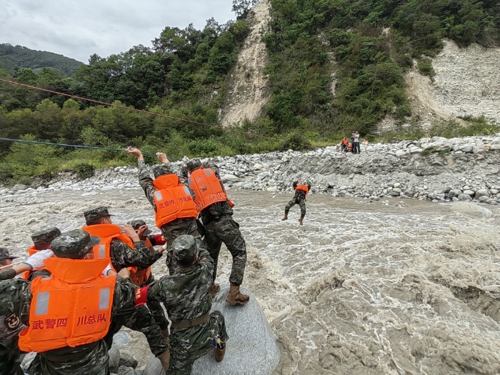 9月6日,武警四川總隊(duì)甘孜支隊(duì)救援官兵在瀘定縣磨西鎮(zhèn)通過(guò)繩索前往河對(duì)岸,救助被困群眾。 新華社發(fā)(張文軒 攝)