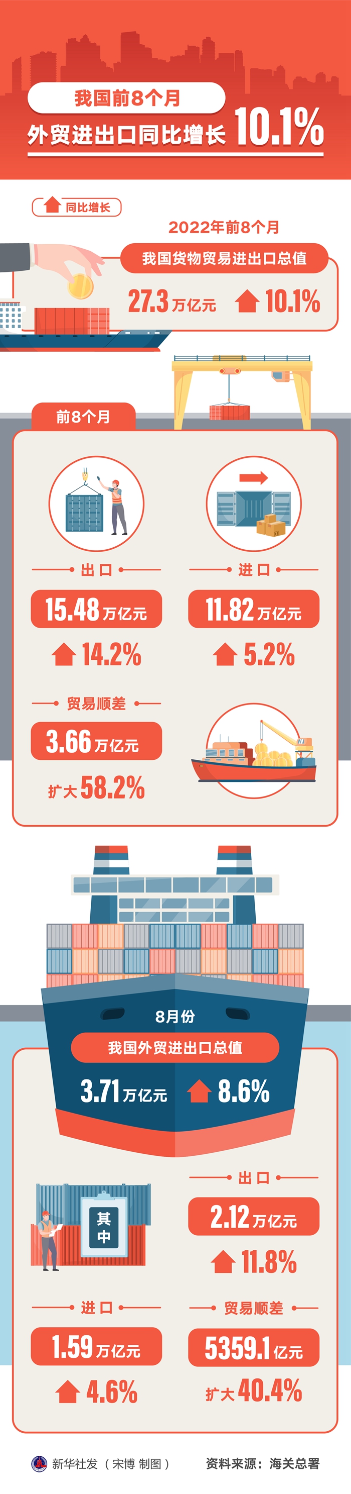 單看8月份,我國外貿(mào)進(jìn)出口總值3.71萬億元,增長8.6%。其中,出口2.12萬億元,增長11.8%;進(jìn)口1.59萬億元,增長4.6%;貿(mào)易順差5359.1億元,擴(kuò)大40.4%。