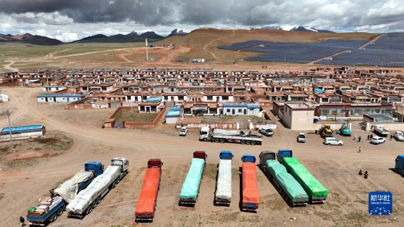 在西藏那曲市雙湖縣多瑪鄉(xiāng)仲魯瑪村,運(yùn)輸家具的貨車整裝待發(fā)(2022年7月13日攝,無人機(jī)照片)。新華社記者 晉美多吉 攝