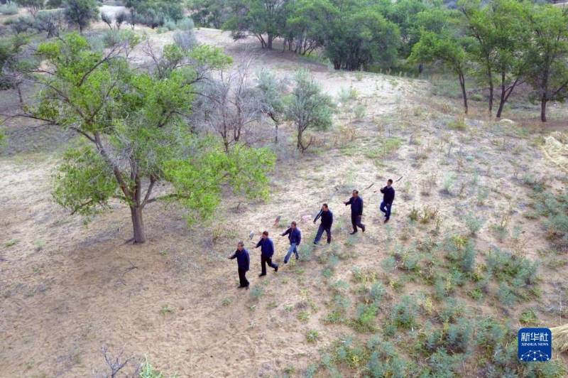 在甘肅省武威市古浪縣八步沙林場(chǎng),場(chǎng)長(zhǎng)郭萬(wàn)剛(左一)和大家一起前往治沙點(diǎn)(2019年8月23日攝,無(wú)人機(jī)照片)。新華社記者 范培珅 攝