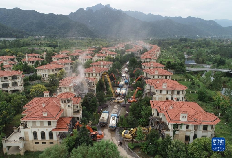 大型機(jī)械在陜西省西安市長(zhǎng)安區(qū)秦嶺違建別墅群“群賢別業(yè)”內(nèi)進(jìn)行拆除工作(2018年9月6日攝,無(wú)人機(jī)照片)。新華社記者 邵瑞 攝