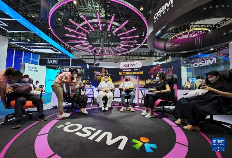 觀眾在第二屆中國(guó)國(guó)際消費(fèi)品博覽會(huì)上體驗(yàn)按摩電競(jìng)椅(2022年7月28日攝)。新華社記者 郭程 攝