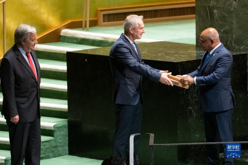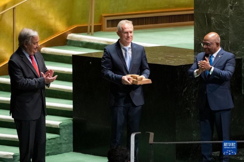 9月12日,在位于紐約的聯(lián)合國總部,第77屆聯(lián)合國大會(huì)主席克勒希(中)從上屆聯(lián)大主席沙希德(右)手中接過象征聯(lián)大主席權(quán)力的木槌。