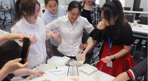 活動在手工巧克力制作教學中進入高潮,在老師的指導下,女職工們認真傾聽、細心操作,一塊塊乳白色的可可脂經過加熱、打散、套模、降溫、塑形等一系列步驟后,瞬間變成了純白光潔的玉兔造型。工序最后,女職工們還親手為玉兔點上紅彤彤的雙眼,燈光交映,一只只活脫脫的玉兔便躍然眼前。