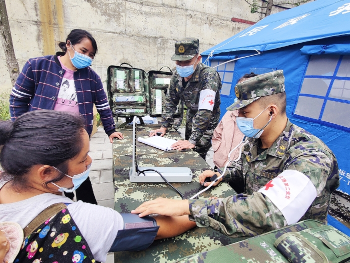 9月7日,武警第二機(jī)動(dòng)總隊(duì)某支隊(duì)官兵為瀘定縣地震災(zāi)區(qū)群眾開展巡診活動(dòng)。新華社發(fā)(李天標(biāo) 攝)