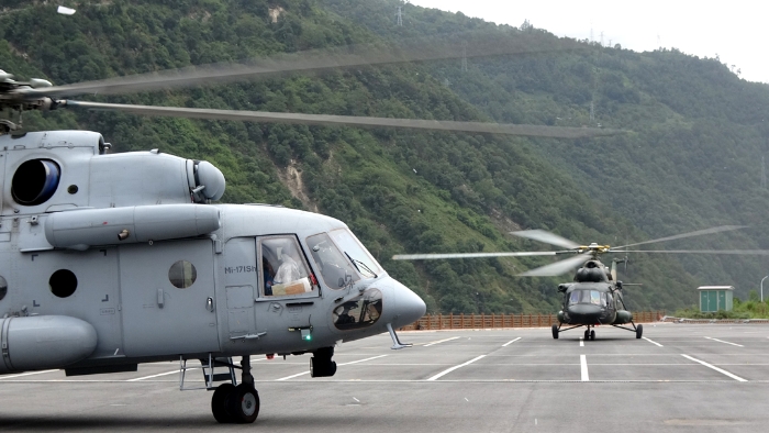 9月6日,西部戰(zhàn)區(qū)空軍運(yùn)輸搜救某團(tuán)兩架直升機(jī)抵達(dá)瀘定縣震中區(qū)域。新華社發(fā)(劉星宇 攝)