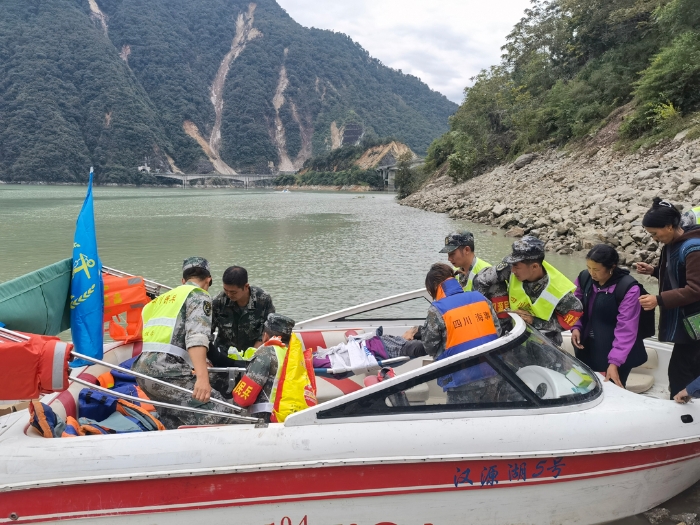 水面,武警第二機(jī)動(dòng)總隊(duì)某支隊(duì)官兵協(xié)助有關(guān)部門吊裝沖鋒舟進(jìn)入大渡河河段,第77集團(tuán)軍某勤務(wù)保障旅通過水上救援路線轉(zhuǎn)移受災(zāi)群眾?! ?/p>