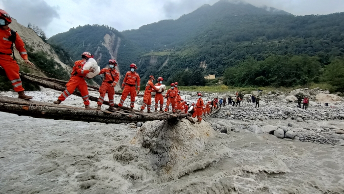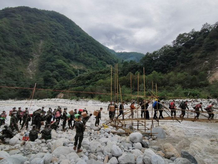 9月8日,武警四川總隊(duì)機(jī)動(dòng)第二支隊(duì)利用簡(jiǎn)易木橋,為瀘定縣磨西鎮(zhèn)青崗坪村的受災(zāi)群眾搬運(yùn)生活物資。新華社發(fā)(段力新 攝)