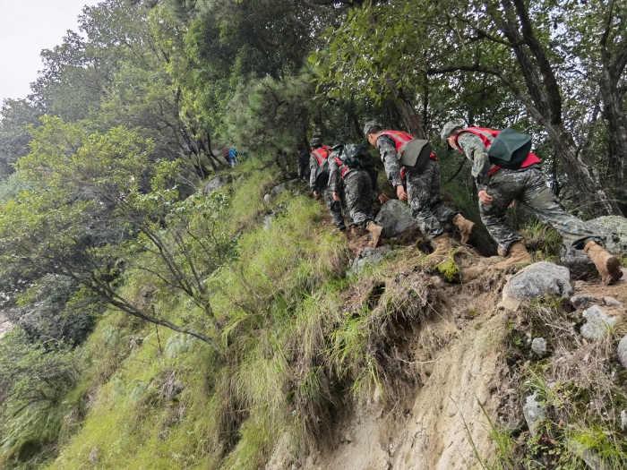 9月7日,武警四川總隊(duì)雅安支隊(duì)官兵沿著山脊開辟山路徒步挺進(jìn)瀘定縣磨西鎮(zhèn)共和村(手機(jī)照片)。新華社發(fā)(洪福樂 攝)