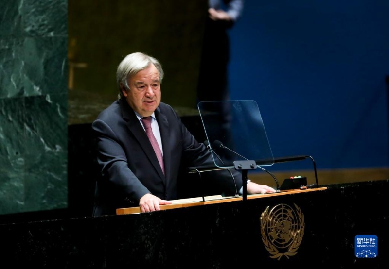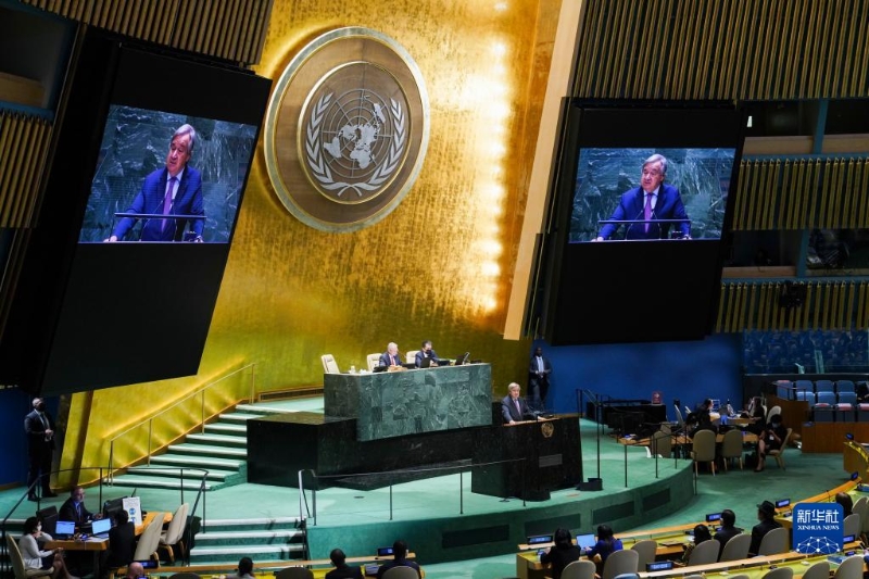 9月13日,在位于紐約的聯(lián)合國總部,聯(lián)合國秘書長古特雷斯在第77屆聯(lián)合國大會第一次全會上致辭。新華社記者 王迎 攝