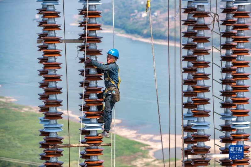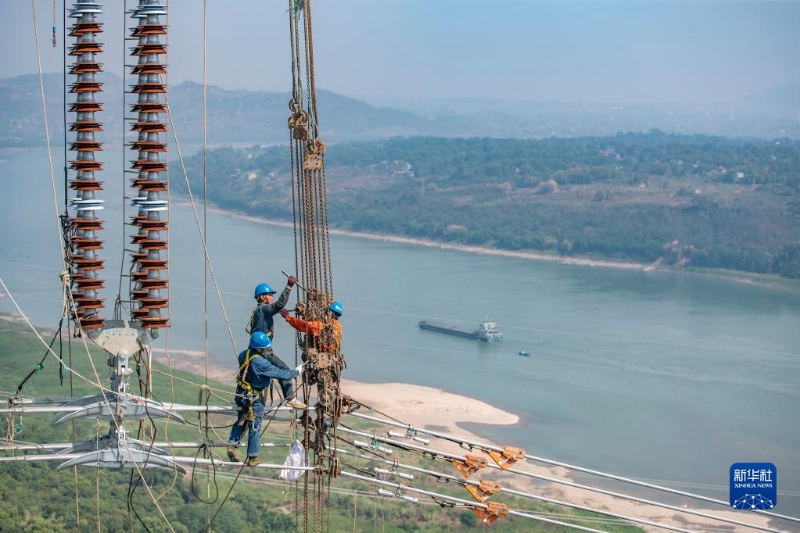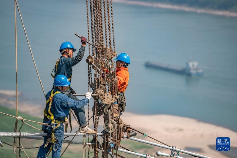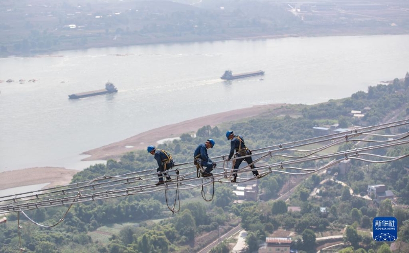 9月13日,工人在白鶴灘-浙江±800千伏特高壓直流輸電線路工程(重慶段)江津長江大跨越施工現(xiàn)場(chǎng)作業(yè)。