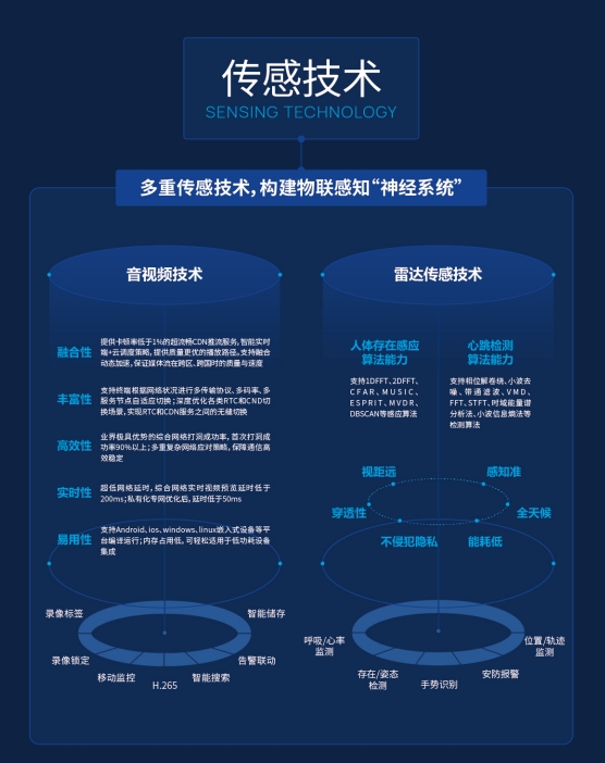 視覺(jué)與雷達(dá)傳感技術(shù)作為萬(wàn)佳安的核心技術(shù)之一,是海量數(shù)據(jù)的接收和傳遞入口。主要有實(shí)時(shí)音視頻技術(shù)及毫米波雷達(dá)傳感技術(shù)。音視頻技術(shù)具有融合性、豐富性、高效性、實(shí)時(shí)性、易用性五大特點(diǎn),可提供卡頓率低于1%的超流暢CDN推流服務(wù),超低網(wǎng)絡(luò)延時(shí),綜合網(wǎng)絡(luò)實(shí)時(shí)視頻預(yù)覽延時(shí)低于200ms,私有化專網(wǎng)優(yōu)化后,延時(shí)低于50ms,提供質(zhì)量更優(yōu)的音視頻播放體驗(yàn)。雷達(dá)傳感技術(shù)具有視距遠(yuǎn)、感知準(zhǔn)、穿透性強(qiáng)、全天候、不侵犯隱私等優(yōu)勢(shì),擁有人體存在感應(yīng)算法能力以及心跳檢測(cè)算法能力,實(shí)現(xiàn)人體存在感知、人體姿態(tài)檢測(cè)、位置軌跡監(jiān)測(cè)、呼吸心跳檢測(cè)等功能。