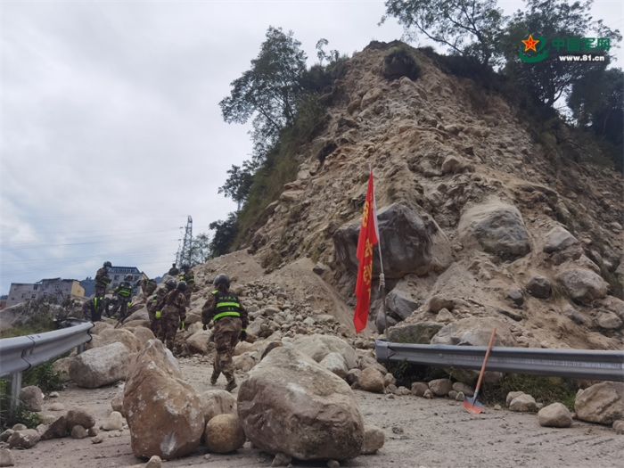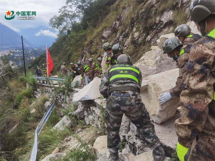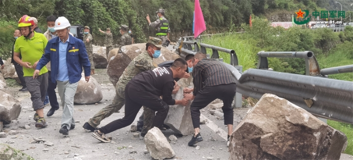 9月5日,甘孜軍分區(qū)先遣組趕赴震中磨西鎮(zhèn)途中,疏通背滾石堵塞的道路。程慶 攝