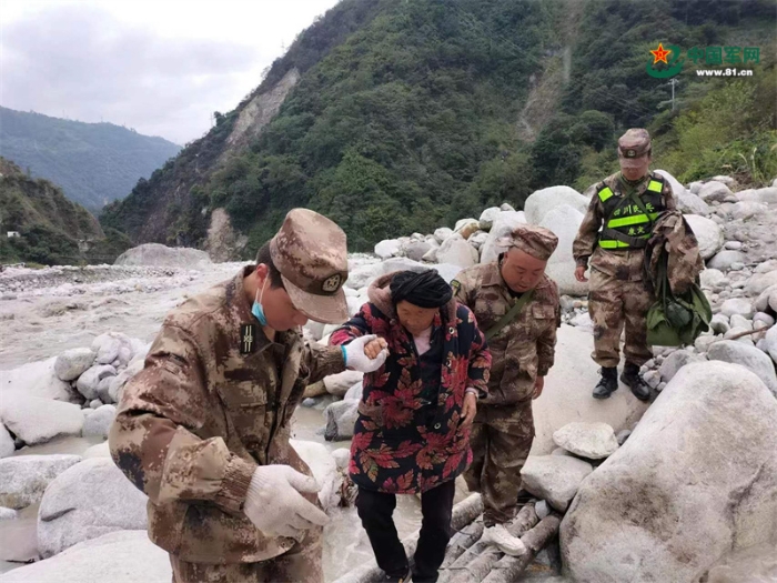 9月8日,康定市民兵在磨西鎮(zhèn)共和村轉(zhuǎn)移90多歲的老人下山。劉君 攝