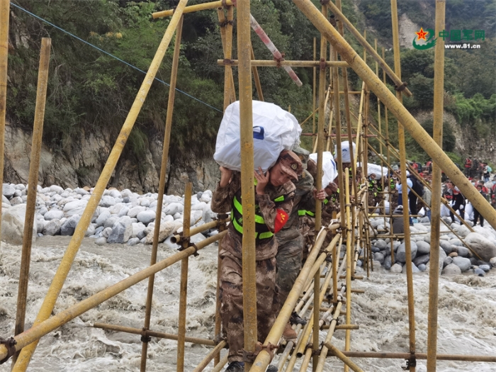 9月8日,康定市民兵通過磨西河便橋,往磨西鎮(zhèn)共和村背負(fù)救災(zāi)帳篷。劉君 攝