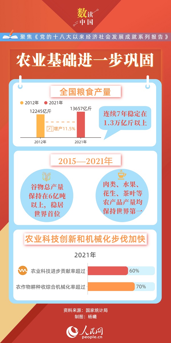 人民網(wǎng)北京9月14日電 (記者楊曦)國家統(tǒng)計局14日發(fā)布《黨的十八大以來經(jīng)濟(jì)社會發(fā)展成就系列報告之二——農(nóng)業(yè)發(fā)展成就顯著 鄉(xiāng)村美麗宜業(yè)宜居》(以下簡稱報告)。報告從我國農(nóng)業(yè)經(jīng)濟(jì)持續(xù)穩(wěn)定增長、主要農(nóng)產(chǎn)品供應(yīng)充裕、農(nóng)業(yè)基礎(chǔ)設(shè)施建設(shè)成就突出、農(nóng)村面貌和人居環(huán)境顯著改善等多個方面總結(jié)了十年來農(nóng)業(yè)發(fā)展的顯著成就。