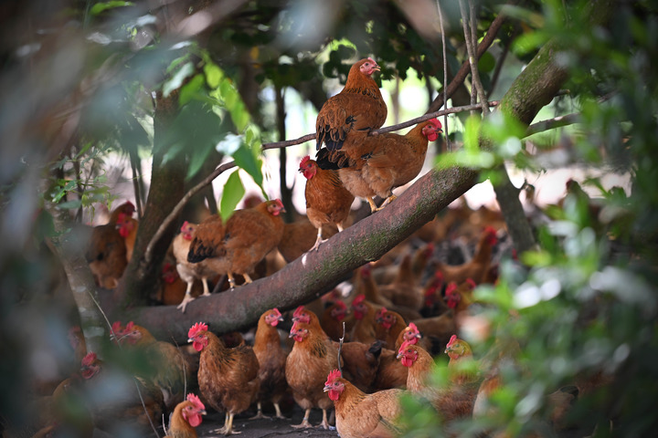 圖為2022年7月13日在文昌市公坡鎮(zhèn)東坑村拍攝的文昌雞。新華社記者郭程 攝