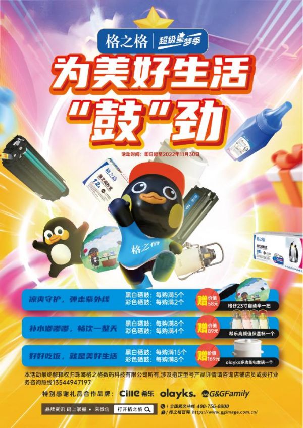 “超星品”作為格之格超級星夢季的主活動,活動時間從9月延續(xù)至11月底,持續(xù)給消費(fèi)者送出超值好禮?;顒赢a(chǎn)品涉及230A、12A、88A等易加粉及易加粉pro+等主流型號黑白硒鼓產(chǎn)品,格之格易加粉Pro+重新定義易加粉,超大容量設(shè)計,進(jìn)一步提升打印頁數(shù),一支抵五支,無需清廢粉;以及202、204、054、118等熱銷型號彩色硒鼓套裝,格之格彩色硒鼓采用超精細(xì)化學(xué)碳粉,色彩還原度高,具備強(qiáng)大介質(zhì)適應(yīng)力,適用于醫(yī)療膠片、照片紙、不干膠、銅版紙等多種打印介質(zhì)。每購滿格之格指定型號產(chǎn)品即送olayks多功能電煮鍋、希樂保溫杯、IP定制自動傘等多樣超值禮品。