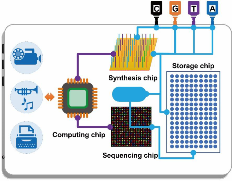 2021年8月元英進(jìn)教授團(tuán)隊(duì)取得DNA存儲(chǔ)的重大突破,從頭編碼設(shè)計(jì)合成了一條長(zhǎng)度為254886堿基對(duì)、專用于數(shù)據(jù)存儲(chǔ)的酵母人工染色體,將兩張經(jīng)典圖片和一段視頻存儲(chǔ)于人造染色體中,利用酵母繁殖實(shí)現(xiàn)了數(shù)據(jù)穩(wěn)定復(fù)制,并用納米孔測(cè)序器件實(shí)現(xiàn)了數(shù)據(jù)快速讀出與無(wú)錯(cuò)恢復(fù)。