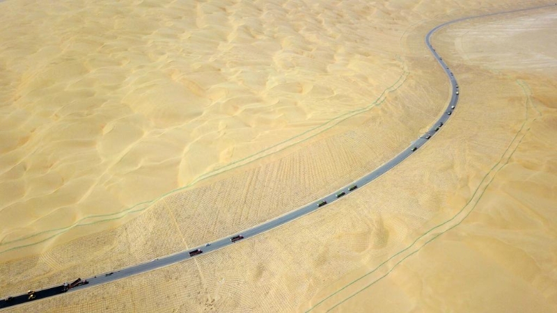 第三條穿越塔克拉瑪干沙漠的公路——新疆尉犁縣至且末縣沙漠公路,筑路工人在進(jìn)行鋪設(shè)瀝青作業(yè)(2021年5月1日攝,無人機(jī)照片)。新華社發(fā)(確·胡熱