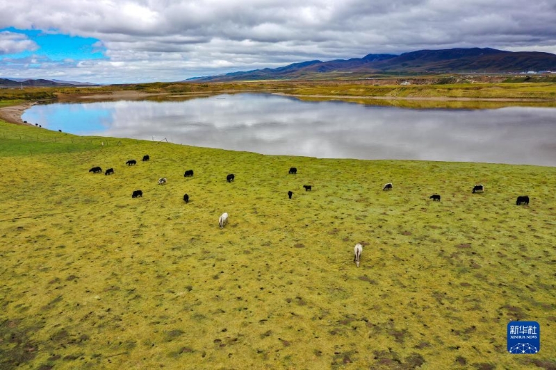 牛群和馬在黃河瑪曲段干流沿岸的一處草地上吃草(9月17日攝,無人機照片)?,斍h在2019年就實現了草畜平衡。
