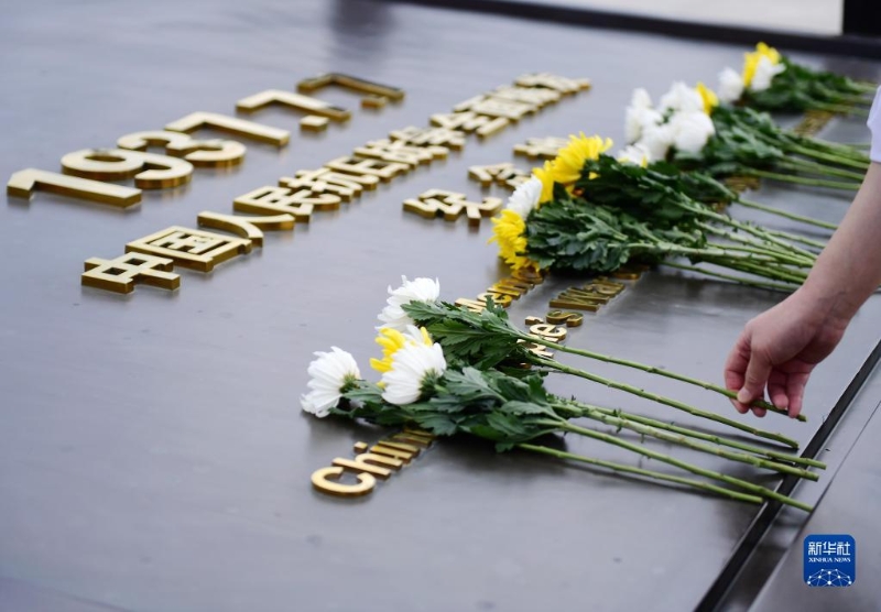 9月18日,中國人民抗日戰(zhàn)爭紀(jì)念館的工作人員向獨立自由勛章雕塑獻花。新華社記者 張晨霖 攝