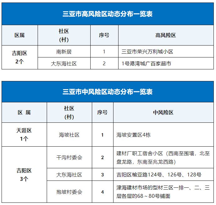 9月19日,記者從海南省三亞市新型冠狀病毒肺炎疫情防控工作指揮部獲悉,根據(jù)當(dāng)前三亞市疫情防控工作需要,按照國(guó)務(wù)院應(yīng)對(duì)新型冠狀病毒肺炎疫情聯(lián)防聯(lián)控機(jī)制綜合組《新型冠狀病毒肺炎防控方案(第九版)》相關(guān)規(guī)定,經(jīng)專(zhuān)家組研判,三亞市疫情防控指揮部決定,將紅旗街社區(qū)椰風(fēng)巷79、81、83號(hào)樓等區(qū)域調(diào)整為低風(fēng)險(xiǎn)區(qū),自通告發(fā)布起,高風(fēng)險(xiǎn)區(qū)調(diào)整為2個(gè)、中風(fēng)險(xiǎn)區(qū)調(diào)整為4個(gè)(見(jiàn)附表)。除高、中風(fēng)險(xiǎn)區(qū)外的區(qū)域?yàn)榈惋L(fēng)險(xiǎn)區(qū)。