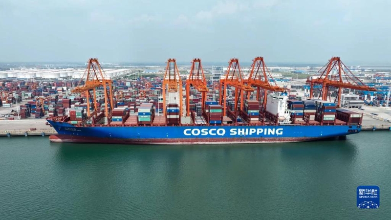 9月13日,一艘海輪??吭跉J州港碼頭裝卸貨物。新華社記者 張愛林 攝