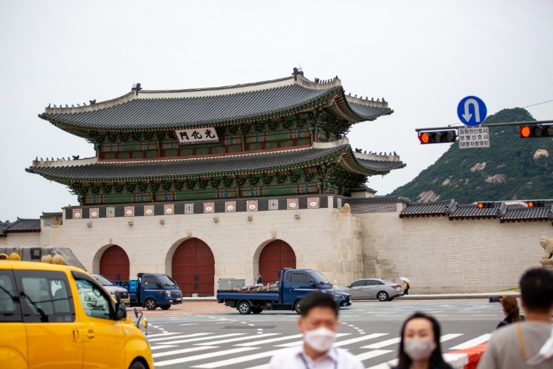 7月12日,車輛和行人在韓國首爾光化門前經(jīng)過。新華社記者王益亮攝