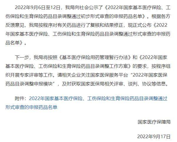 中新網(wǎng)9月17日電 17日,國家醫(yī)保局官網(wǎng)正式公布了《2022年國家基本醫(yī)療保險(xiǎn)、工傷保險(xiǎn)和生育保險(xiǎn)藥品目錄調(diào)整通過形式審查的申報(bào)藥品名單》,共343種藥品正式通過形式審查。