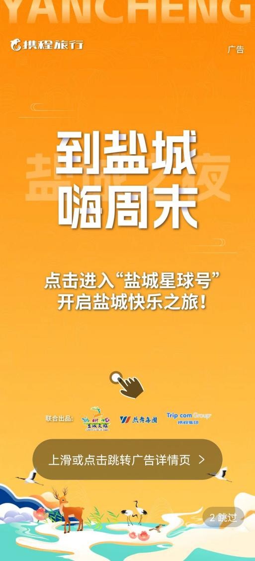 同時“到鹽城·嗨周末”上線攜程APP首頁開屏、首頁信息流等資源。攜程用戶點開攜程APP即可跳轉(zhuǎn)鹽城星球號。