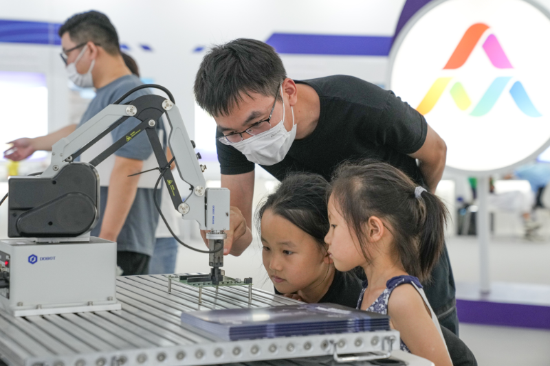 在2022年全國“雙創(chuàng)周”合肥主題展區(qū),家長帶著孩子參觀創(chuàng)新產(chǎn)品。新華社記者 杜宇 攝