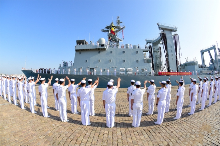 上午9時許,護航編隊艦艇緩緩駛離碼頭,任務(wù)官兵在甲板上整齊列隊,揮手向祖國和親人告別。