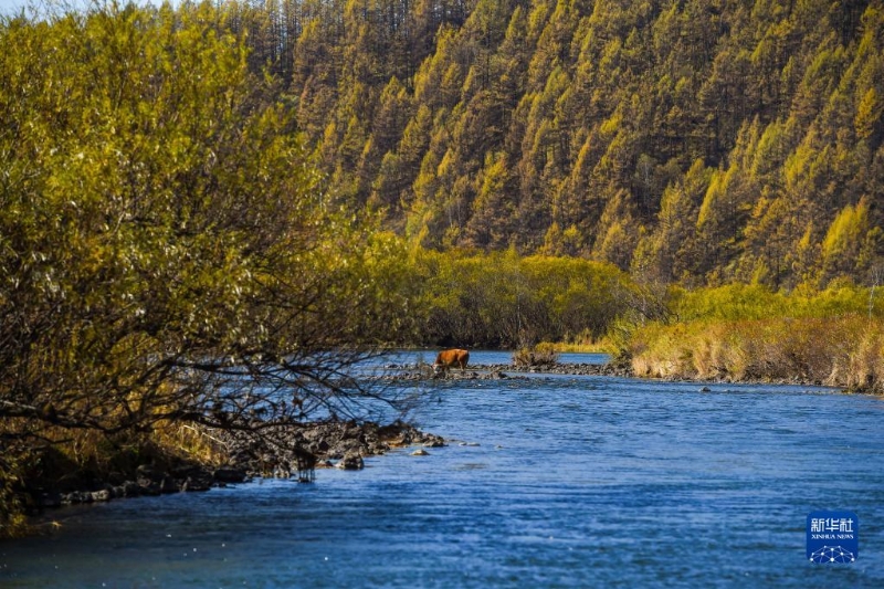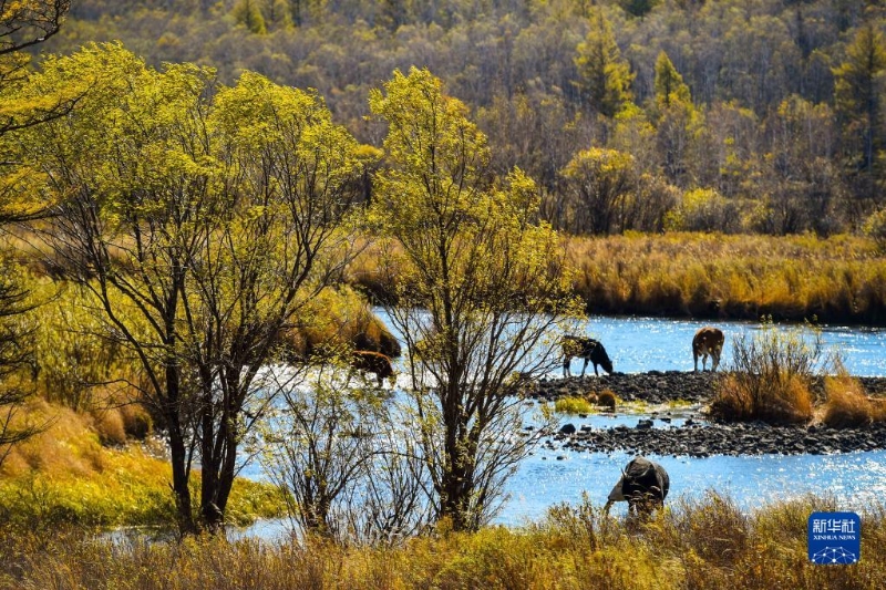 9月21日,牛群在阿爾山國家森林公園內(nèi)的河岸邊覓食?! ?/p>