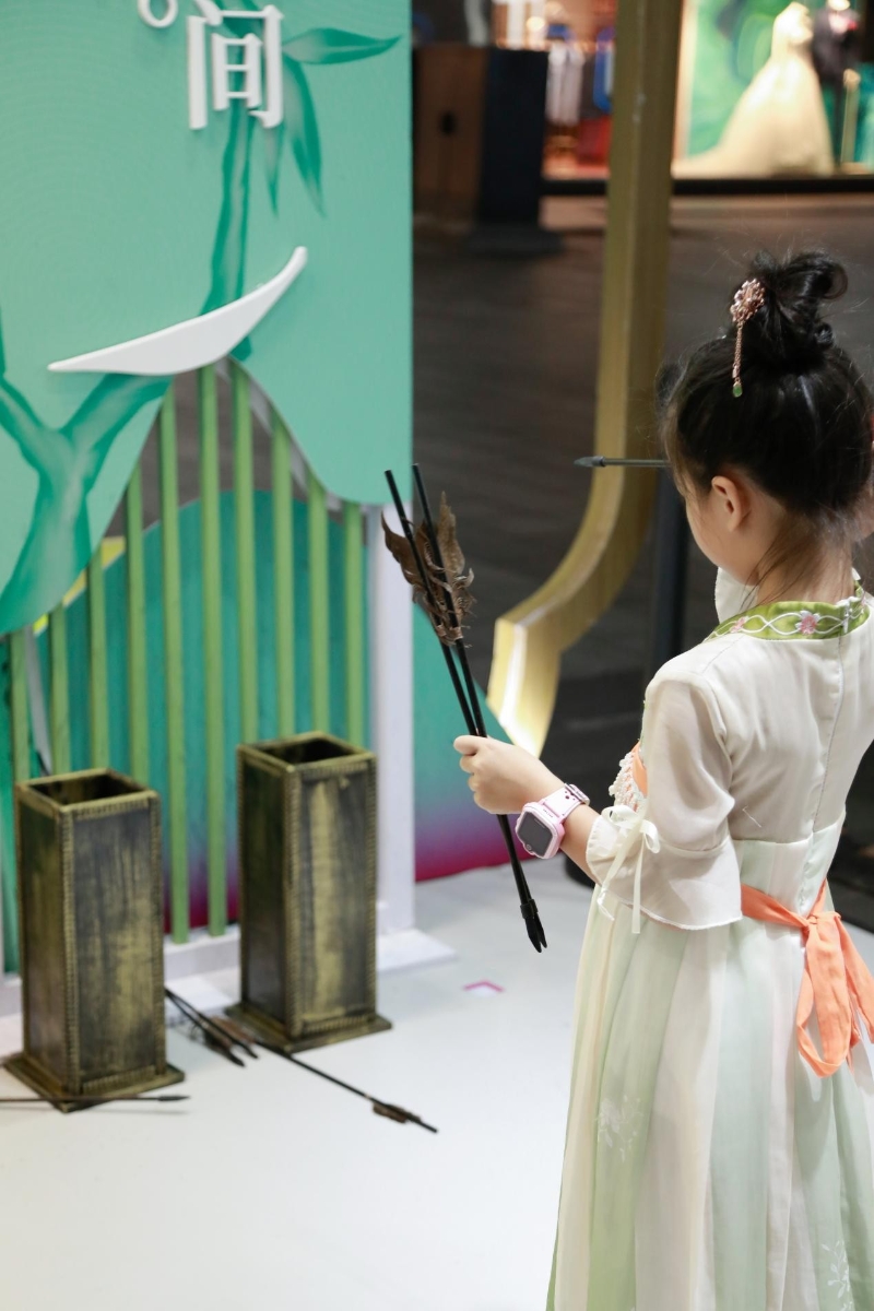 宋韻文化品牌山外山受邀參展。進入山外山“真是人間好時節(jié)”的主題展館,恍如置身于古建筑中。不少身著中式服飾的游人進行著點茶、投壺等宋時文娛活動,亦或打卡拍照,品嘗美食。館內,從宋青色、桃源色的色彩搭配到油紙傘、青瓷等空間美陳,這些搭載多元文化符號的美學設計讓人沉浸式體驗到宋韻生活的風雅。西子湖畔,一面是湖光山色,一面是市井繁華。