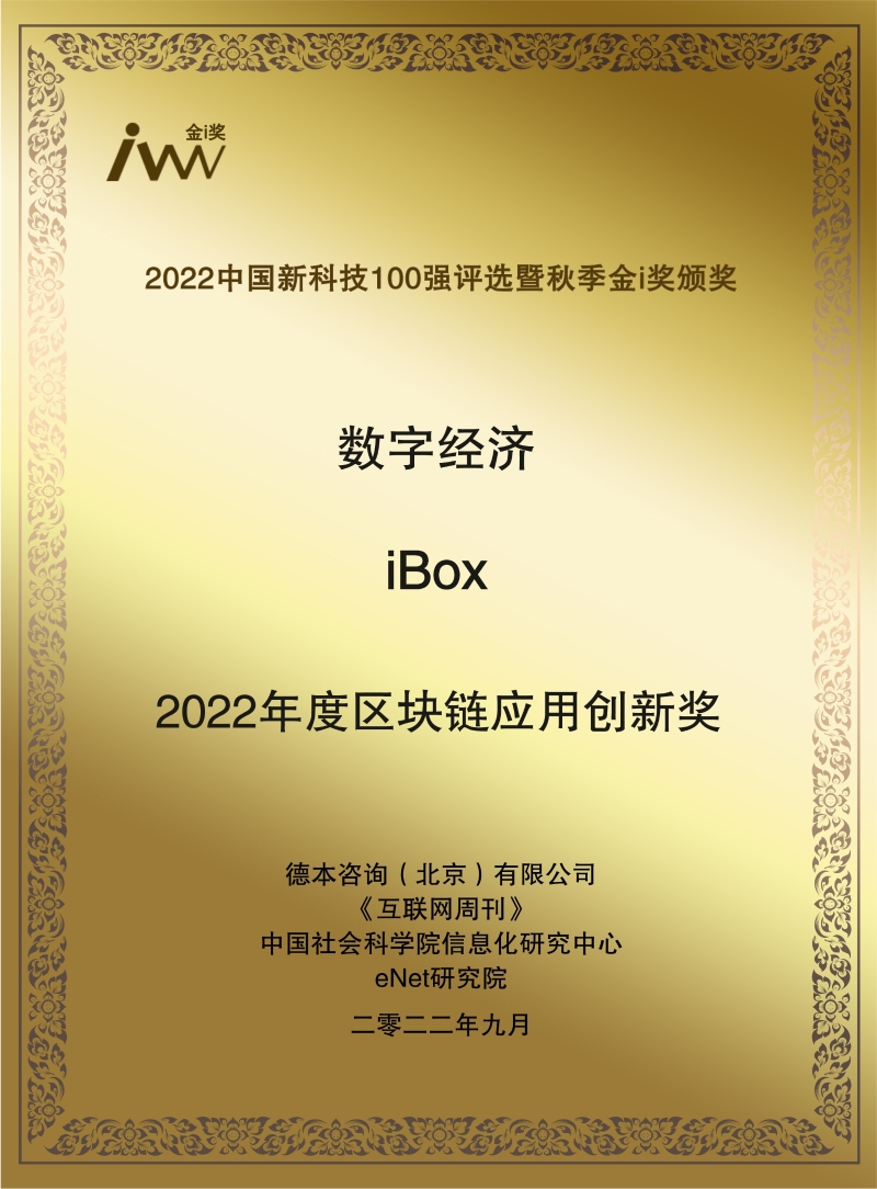 近日,中國科學(xué)院《互聯(lián)網(wǎng)周刊》、中國社會科學(xué)院信息化研究中心、eNet研究院、德本咨詢(北京)有限公司作為主辦的“2022中國新科技100強評選暨秋季金i獎頒獎”順利舉行,聚焦當(dāng)下,世界各國紛紛加大先進科技的研究投入,搶占核心技術(shù)的制高點。與各行各業(yè)一道,共同探尋中國新科技的力量。iBox鏈盒獲得了數(shù)字經(jīng)濟領(lǐng)域的2022年度區(qū)塊鏈應(yīng)用創(chuàng)新獎。