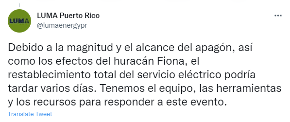 颶風(fēng)登陸后,魯瑪能源公司在推特上發(fā)帖,告知用戶(hù)“完全恢復(fù)供電可能需要幾天時(shí)間”。(推特截圖)