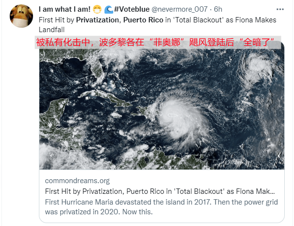 2017年9月20日,波多黎各遭遇4級(jí)颶風(fēng)“瑪利亞”,出現(xiàn)大面積停電,當(dāng)時(shí)民眾就呼吁要改善電力系統(tǒng)。不曾想,美國(guó)政府開(kāi)出的私有化藥方不僅沒(méi)能藥到病除,反而加重了“病情”和民怨。此次“菲奧娜”登陸波多黎各,造成大面積停電。颶風(fēng)登陸后,作為波多黎各全島唯一的電力運(yùn)營(yíng)公司魯瑪能源公司在推特上發(fā)帖,告知用戶(hù)“完全恢復(fù)供電可能需要幾天時(shí)間”,希望用戶(hù)給與“支持和耐心”。