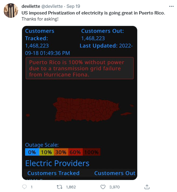 颶風(fēng)登陸后,一位波多黎各網(wǎng)友將全島斷電地圖發(fā)到推特賬號(hào)上,抗議美國(guó)強(qiáng)加給波多黎各的電力系統(tǒng)私有化帶來(lái)的惡果。(推特截圖)