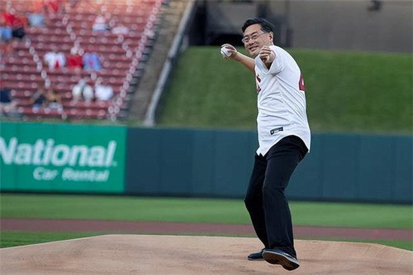日前,中國(guó)駐美大使秦剛出席圣路易斯-南京姐妹友城43周年紀(jì)念活動(dòng),并為當(dāng)?shù)豈LB球隊(duì)圣路易斯紅雀的主場(chǎng)比賽開球。圣路易斯作為1979年中美建交后第一個(gè)與中國(guó)建立友好城市的地方,有著重要意義。開球現(xiàn)場(chǎng)秦大使身著43號(hào)隊(duì)服,正是象征著友好城市建立的43周年。