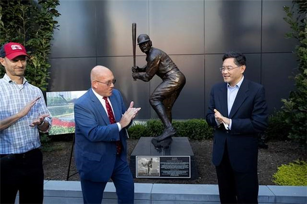 紅雀的球場(chǎng)外,秦剛大使還出席了友城紀(jì)念雕像揭牌儀式。南京的雕像是投球手,圣路易斯的雕像是擊球手。這座擊球手雕像,與2019年圣路易斯贈(zèng)與南京的投球手雕像互為一組。這一“球”,隔空傳遞了友好和熱愛。秦剛大使發(fā)文說(shuō):“我作為開球嘉賓,在圣路易斯紅雀(St. LouisCardinals)和辛辛那提紅人(Cincinnati Reds)的棒球比賽中投出第一球,紀(jì)念南京和圣路易斯建立第一個(gè)中美友好城市43周年。同時(shí),為兩個(gè)城市的第一對(duì)棒球運(yùn)動(dòng)員雕像揭幕。”
