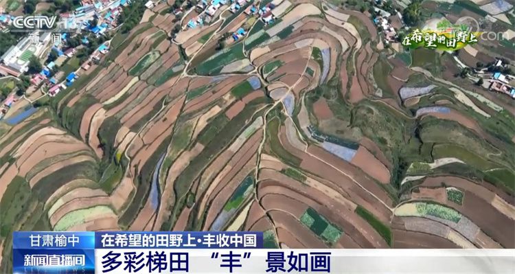 您現(xiàn)在看到的是甘肅蘭州榆中縣馬坡鄉(xiāng)的千畝梯田,高原夏菜依山順坡交錯(cuò)成熟,綠色的白菜、藍(lán)色的紫甘藍(lán)、黃色的小麥和已收獲后的棕色土地組成了一塊色彩斑斕的“調(diào)色盤(pán)”。