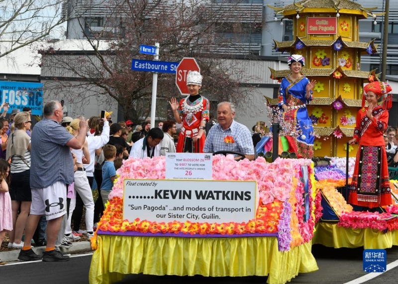 9月24日,在新西蘭黑斯廷斯,凱文·沃特金斯(前)駕駛自己的中國主題花車參加花車巡游活動。