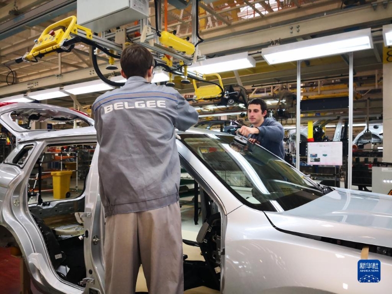 在白俄羅斯首都明斯克東北方向50公里處的白俄羅斯吉利全散件汽車(chē)制造廠(chǎng)總裝車(chē)間,工人組裝車(chē)體(2018年12月1日攝)。新華社記者 張若玄 攝