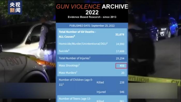 美國“槍支暴力檔案”網(wǎng)站的數(shù)據(jù)顯示,截至9月25日,美國今年以來已發(fā)生498起造成至少4人死傷的“大規(guī)模槍擊”事件,已有超過3.26萬人因槍支暴力喪生。(來源:央視新聞客戶端)