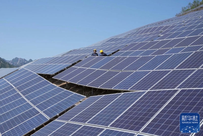 9月24日,國網(wǎng)平山縣供電公司的工人在平山縣營里鄉(xiāng)桃園10千伏儲能站光伏發(fā)電板區(qū)巡查。新華社記者 楊世堯 攝